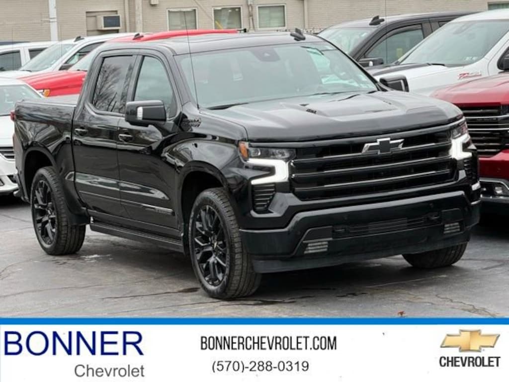 Bonner Chevrolet is proud to present you with another True Market Priced Pre-Owned Vehicle. This 2025 Chevrolet Silverado 1500 High Country is loaded with the following Factory Options: Silverado 1500 High Country, 4D Crew Cab, EcoTec3 6.2L V8, 10-Speed Automatic, 4WD, Black, and Black Leather High Capacity Suspension Package, Midnight Edition (Black Body Side Moldings, Black Door Handles, Black Dual Exhaust Tips, Black Grille, Black Mirror Caps, Black Power-Retractable Assist Steps, Dark Headlamp Bezel, Front Frame-Mounted Black Recovery Hooks, and Wheels: 20 x 9 High Gloss Black Painted Alum), Preferred Equipment Group 3LZ (10-Way Power Driver Seat w/Lumbar, 10-Way Power Passenger Seat Adjuster w/Lumbar, 12.3 Multicolor Reconfigurable Digital Display, 120-Volt Bed Mounted Power Outlet, 120-Volt Interior Power Outlet, 2 USB Data Ports, 2nd Row Heated Outboard Seats, Adaptive Cruise Control, Auto-Dimming Inside Rear-View Mirror, Auto-Locking Rear Differential, Bed View Camera, Bluetooth® For Phone, Body-Color Painted Mirror Caps, Chevytec Spray-On Black Bedliner, Chrome Assist Steps, Chrome Recovery Hooks, Color-Keyed Carpeting Floor Covering, Deep-Tinted Glass, Driver Memory, Dual Exhaust w/Polished Outlets, Dual Rear USB Ports (Charge Only), Electric Rear-Window Defogger, Floor Mounted Center Console, Front Carpeted Floor Mats, Front LED Fog Lamps, Front Rain-Sensing Wipers, HD Surround Vision, Heated Driver & Front Outboard Passenger Seats, Heated Steering Wheel, Hitch Guidance w/Hitch View, In-Vehicle Trailering System App, Integrated Trailer Brake Controller, Keyless Open & Start, LED Cargo Area Lighting, OnStar Services Capable, Outside Heated Power-Adjustable Mirrors, Perimeter Lighting, Power Front Passenger Windows w/Express Up/Down, Power Front Windows w/Driver Express Up/Down, Power Rear Windows w/Express Down, Power Sliding Rear Window w/Rear Defogger, Power Tailgate, Power Tilt & Telescoping Steering Column, Rear Carpeted Floor Mats, Rear Cross Traffic Braking, Rear Pedestrian Alert, Rear Wheelhouse Liners, Remote Vehicle Starter System, Safety Alert Seat, SiriusXM w/360L Trial Subscription, Standard Tailgate, Steering Wheel Audio Controls, Teen Driver, Theft Deterrent System (Unauthorized Entry), Tire Pressure Monitoring System, Trailer Camera Provisions, Trailer Side Blind Zone Alert, Ultrasonic Front & Rear Park Assist, Universal Home Remote, Ventilated Driver & Front Passenger Seats, Wi-Fi Hot Spot Capable, and Wrapped Steering Wheel), Technology Package (15 Diagonal Multicolor Head-Up Display and Rear Camera Mirror), Trailering Package (Hitch Guidance), Up-Level Rear Seat w/Storage Package, Silverado 1500 High Country, 4D Crew Cab, EcoTec3 6.2L V8, 10-Speed Automatic, 4WD, Black, Black Leather, 170 Amp Alternator, 3.23 Rear Axle Ratio, 4-Wheel Disc Brakes, 7 Speakers, ABS brakes, Adaptive Ride Control Suspension, Air Conditioning, Alloy wheels, AM/FM radio: SiriusXM with 360L, Apple CarPlay/Android Auto, Auto High-beam Headlights, Auto-dimming door mirrors, Auto-dimming Rear-View mirror, Automatic temperature control, Bodyside moldings, Brake assist, Bumpers: body-color, Compass, Delay-off headlights, Driver door bin, Driver vanity mirror, Dual Active Exhaust, Dual front impact airbags, Dual front side impact airbags, Electronic Stability Control, Electronic Transmission Range Selector Shifter, Emergency communication system: OnStar, Enhanced Automatic Emergency Braking, Following Distance Indicator, Forward Collision Alert, Front anti-roll bar, Front Bucket Seats, Front Center Armrest, Front dual zone A/C, Front fog lights, Front License Plate Kit, Front Pedestrian Braking, Front reading lights, Front wheel independent suspension, Fully automatic headligh