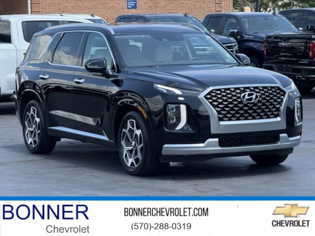 Bonner Chevrolet is proud to present you with another True Market Priced Pre-Owned Vehicle. This 2021 Hyundai Palisade Calligraphy is loaded with the following Factory Options: Palisade Calligraphy, 4D Sport Utility, V6, 8-Speed Automatic with SHIFTRONIC, AWD, Becketts Black, and Dark Brown Leather Option Group 01, Palisade Calligraphy, 4D Sport Utility, V6, 8-Speed Automatic with SHIFTRONIC, AWD, Becketts Black, Dark Brown Leather, 12 Speakers, 3.648 Axle Ratio, 3rd row seats: split-bench, 4-Wheel Disc Brakes, ABS brakes, Air Conditioning, Alloy wheels, AM/FM radio: SiriusXM, Apple CarPlay & Android Auto, Auto High-beam Headlights, Auto-dimming Rear-View mirror, Auto-leveling suspension, Automatic temperature control, Brake assist, Bumper Applique, Bumpers: body-color, Cargo Cover/Screen, Cargo Net, Cargo Tray, Carpeted Floor Mats, Compass, Delay-off headlights, Driver door bin, Driver vanity mirror, Dual front impact airbags, Dual front side impact airbags, Electronic Stability Control, Emergency communication system: Blue Link Connected Car Service (3-year complimentary subscription), Four wheel independent suspension, Front anti-roll bar, Front Bucket Seats, Front Center Armrest, Front dual zone A/C, Front reading lights, Fully automatic headlights, Garage door transmitter: HomeLink, harman/kardon® Speakers, Heads-Up Display, Heated & Ventilated Front Bucket Seats, Heated door mirrors, Heated front seats, Heated rear seats, Heated steering wheel, Illuminated entry, Knee airbag, Low tire pressure warning, Memory seat, Navigation System, Occupant sensing airbag, Outside temperature display, Overhead airbag, Overhead console, Panic alarm, Passenger door bin, Passenger vanity mirror, Power door mirrors, Power driver seat, Power Liftgate, Power moonroof, Power passenger seat, Power steering, Power windows, Premium Nappa Leather Seat Trim, Radio data system, Radio: AM/FM/MP3 Premium Audio System, Rain sensing wipers, Rear air conditioning, Rear anti-roll bar, Rear reading lights, Rear window defroster, Rear window wiper, Reclining 3rd row seat, Remote keyless entry, Security system, Speed control, Speed-sensing steering, Split folding rear seat, Spoiler, Steering wheel mounted audio controls, Tachometer, Telescoping steering wheel, Tilt steering wheel, Traction control, Trip computer, Turn signal indicator mirrors, Variably intermittent wipers, Ventilated front seats, Ventilated rear seats, Wheel Locks, and Wheels: 20 x 7.5J Calligraphy Exclusive Alloy!!