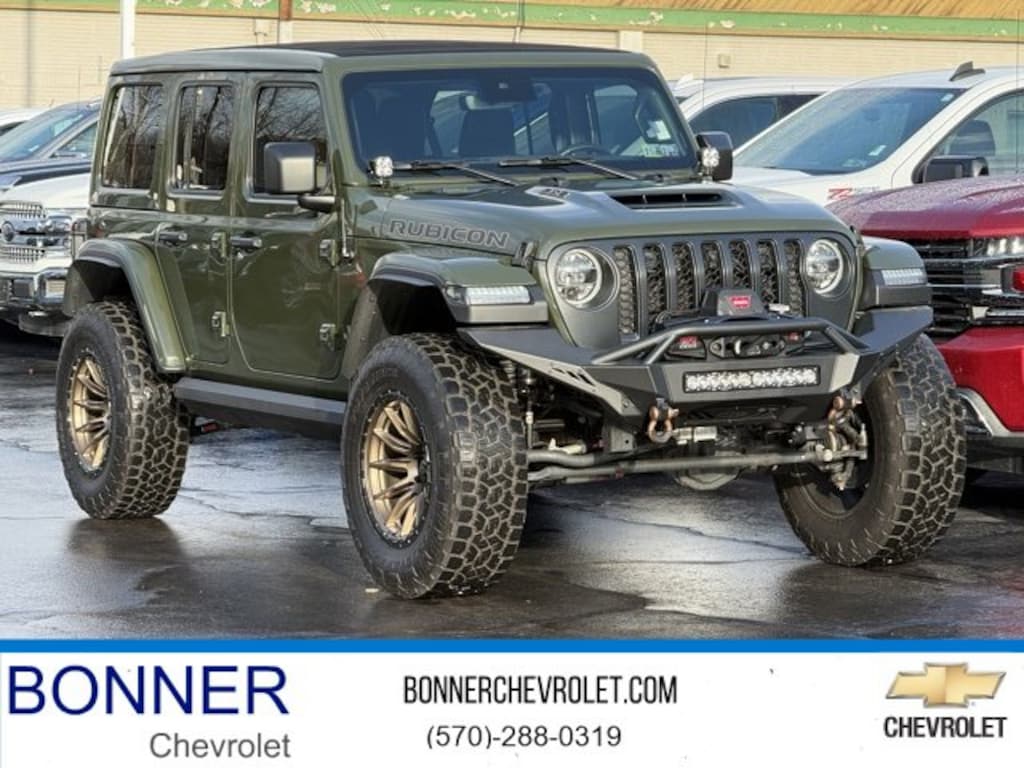 Bonner Chevrolet is proud to present you with another True Market Priced Pre-Owned Vehicle. This 2022 Jeep Wrangler Unlimited Rubicon 392 is loaded with the following Factory Options: Wrangler Unlimited Rubicon 392, 4D Sport Utility, SRT HEMI 6.4L V8 MDS, 8-Speed Automatic, 4WD, Sarge Green Clearcoat, and Black Leather Quick Order Package 27X, Trailer Tow Package (7 & 4 Pin Wiring Harness and Class II Receiver Hitch), Wrangler Unlimited Rubicon 392, 4D Sport Utility, SRT HEMI 6.4L V8 MDS, 8-Speed Automatic, 4WD, Sarge Green Clearcoat, Black Leather, 3.73 Rear Axle Ratio, 4-Wheel Disc Brakes, 9 Speakers, ABS brakes, Air Conditioning, Alloy wheels, AM/FM radio: SiriusXM, Apple CarPlay/Android Auto, Auto High-beam Headlights, Auto-dimming Rear-View mirror, Automatic temperature control, Brake assist, Compass, Convertible HardTop, Corning Gorilla Glass, Delay-off headlights, Driver door bin, Driver vanity mirror, Dual front impact airbags, Dual front side impact airbags, Electronic Stability Control, Emergency communication system: SiriusXM Guardian, Freedom Panel Storage Bag, Front anti-roll bar, Front Bucket Seats, Front Center Armrest w/Storage, Front dual zone A/C, Front fog lights, Front License Plate Bracket, Front reading lights, Fully automatic headlights, Garage door transmitter, Glass rear window, Heated door mirrors, Heated front seats, Heated steering wheel, Illuminated entry, Integrated Off-Road Camera, Integrated roll-over protection, Leather Shift Knob, Leather steering wheel, Leather Trimmed Bucket Seats, Low tire pressure warning, Manufacturer's Statement of Origin, MOPAR Hinge-Gate Reinforcement, MOPAR Satin Black Grille, Navigation System, Occupant sensing airbag, Outside temperature display, Panic alarm, ParkView Rear Back-Up Camera, Passenger door bin, Passenger vanity mirror, Power door mirrors, Power steering, Power Top Quarter Window Storage Bag, Power windows, Radio data system, Radio: Uconnect 4C Nav w/8.4 Display, Rear anti-roll bar, Rear reading lights, Rear seat center armrest, Rear Window Defroster, Rear window defroster, Rear window wiper, Rear Window Wiper/Washer, Remote keyless entry, Removable Rear Quarter Windows, Rubicon 392 Suspension, Security system, Sky 1-Touch Power Top, Speed control, Split folding rear seat, Steering wheel mounted audio controls, Tachometer, Telescoping steering wheel, Tilt steering wheel, Traction control, Trip computer, Variably intermittent wipers, Voltmeter, and Wheels: 17 x 7.5 Beadlock Capable!!